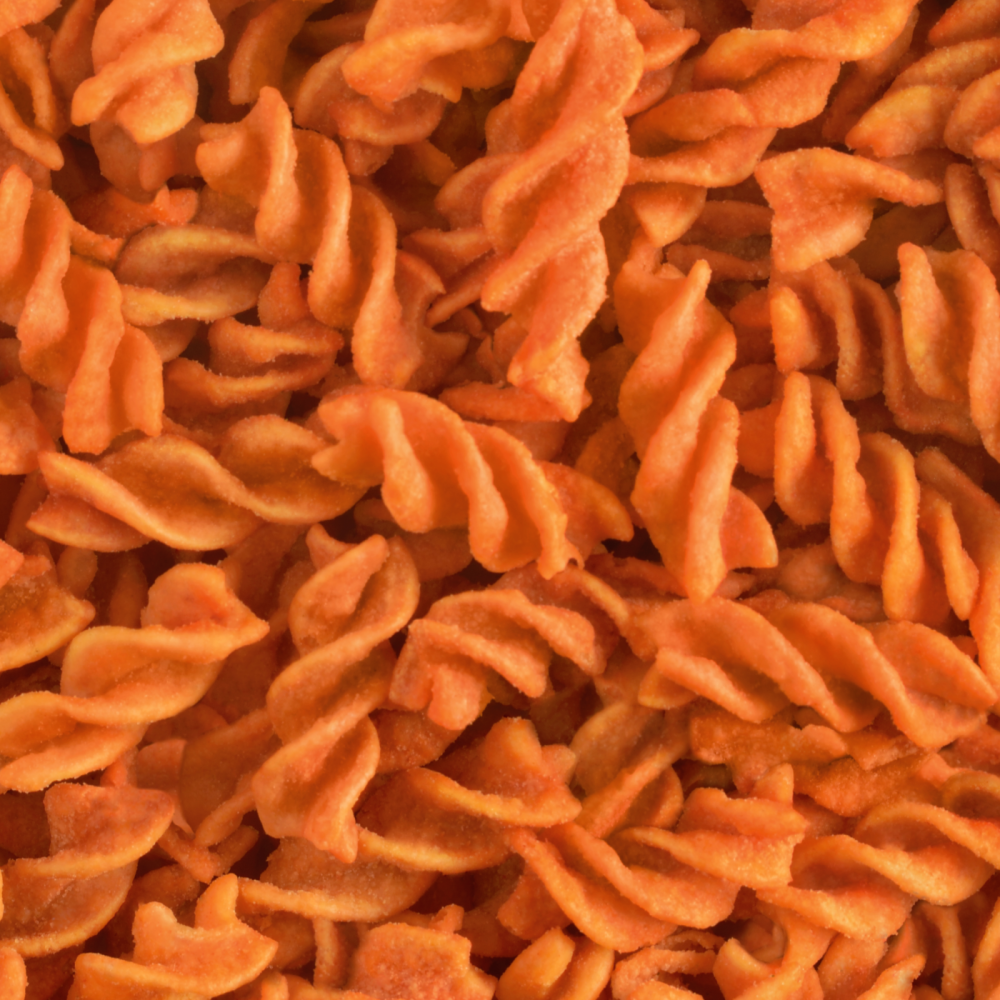 Ingredients: Durum wheat semolina (gluten), wheat flour (gluten), corn flour, vegetable oil (palm oil), ketchup flavored seasoning [sugar, flavor enhancers: monosodium glutamate (E621), disodium 5’-ribonucleotide; salt, acidity regulators: sodium diacetate, citric acid (E330), malic acid; color: paprika extract (E160c); vegetable oil (palm); flavoring: tomato; anti-caking agent: silicon dioxide (E551); flavoring and coloring: cocoa powder; antioxidant: butylated hydroxytoluene (E321)], sugar, salt.